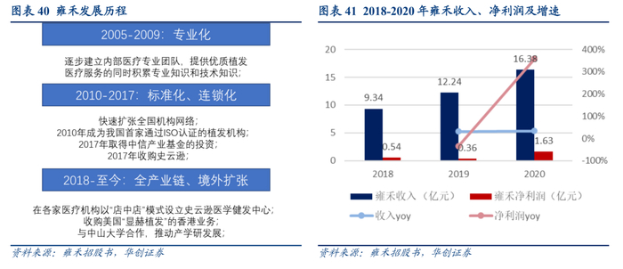 民营机构众多,雍禾市占率约11%。据雍禾招股书,全国(性的)民营机构占比23.9%;其他民营植发机构开设门槛低、运营灵活,占比45.6%;美容机构的植发部门和公立医院植发科占比在15%上下。目前国内全国性的植发机构有四家:雍禾、碧莲盛、科发源(大麦)和新生(莆田系),其中2020年雍禾植发医疗服务市场份额约为11%,为国内top1。