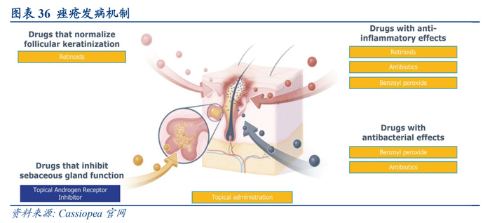 除脱发外,痤疮是另外一个与雄激素相关的疾病,又被称为粉刺或者青春痘,是毛囊皮脂腺单位的一种慢性炎症性皮肤病,多发于青春期并主要累及面部,是发病人数最多的皮肤疾病。根据弗若斯特沙利文报告,2018年,中国有超过1.189亿名年龄介于10至25岁的患者有寻常痤疮。痤疮发病机制复杂,雄激素及其受体信号通路对皮脂腺及皮脂分泌的影响是引起痤疮的重要因素之一。AR拮抗剂能抑制二氢睾酮(DHT)的局部皮肤作用,同时可抑制产油细胞(sebcyte)的脂质生成,并减少受雄激素影响的促炎性细胞因子和介质,从而治疗痤疮。