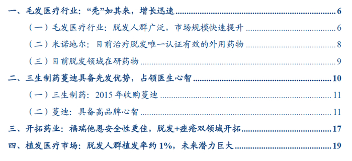 本文第一部分为医疗行业概况,治疗药物成分米诺地尔及目前在研药物。第二部分为三生制药主营业务及脱发板块蔓迪的状况。第三部分开拓药业旗下福瑞他恩靶向治疗临床II期即将结束,局部给药避免难言的副作用。第四部分为重度脱发人群且后枕部有较充足资源的人群的治疗手段——植发治疗公司雍禾情况。