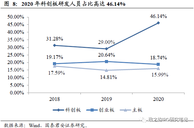 科创板总体研发人员占比超三成,医药生物及电子行业研发队伍最为充实。从研发人员占比情况来看, 2018-2020年科创板平均研发人员占比为31.28%/29.00%/46.14%,相比创业板19.17%/20.64%/18.74%和主板17.59%/14.81%/15.99%而言,科创板研发人数占比明显更高。科创板医药生物及电子行业研发人员占比表现最为突出,2020年医药生物行业的神州细胞、成都先导以及电子行业的芯原股份、晶晨股份等企业以82.05%/83.62%/85.98%/80.33%的科研人员占比,居于科创板研发人员占比前列。