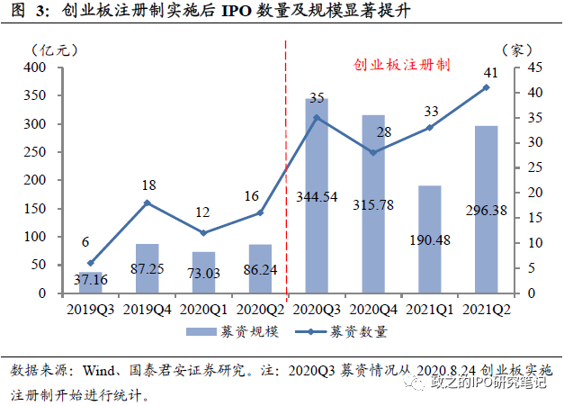 创业板注册制实施后IPO数量及募资规模均有明显上升。2019Q3至2021Q2,创业板IPO数量从注册制实施前的6/18/12/16家上升至35/28/33/41家,募资规模从37.16/87.25/73.03/86.24亿元提升至344.54/315.78/190.48/296.38亿元。仅创业板注册制实施的第一个季度(2020Q3),创业板募资总额超过实施前四个季度(2019Q3-2020Q2)募资额总和。