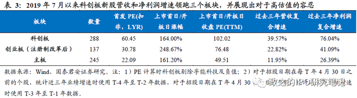 稀缺赛道龙头个股及高成长绩优个股上市表现亮眼,注册制板块对估值容忍度更高。科创板开板后所有个股的平均首发PE为60.45倍,而上市当天收盘价对应PE为102.02倍,接近翻倍;创业板注册制改革后则是平均首发PE的30.78倍涨到上市首日收盘对应的76.48倍;而主板仅从首发的23倍涨到开板日的平均49.51倍。