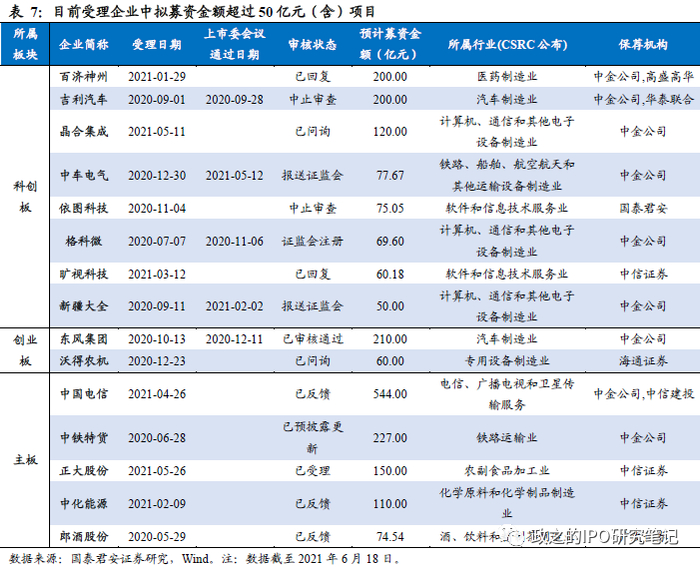 二季度大型项目平稳发行,科创板储备充足。2021年一季度IPO发行项目整体较小,没有募资规模超过50亿元的项目发行,进入二季度后大型项目陆续发行,和辉光电(首发募资金额81.72亿元)、三峡能源(首发募资金额227.13亿元)分别在5月、6月上市,市场环境整体良好背景下大型项目发行节奏平稳。从储备项目上来看,拟募资金额超过50亿元的项目共15个,其中科创板占据8席,科创板企业强调“硬科技”属性,处于快速发展期的创新企业有望通过IPO获得资金支持,资本市场服务实体经济职能良好发挥。