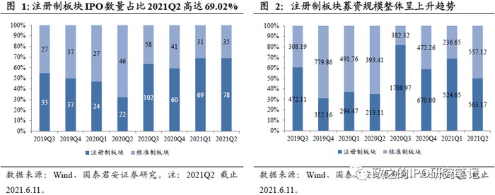 注册制板块IPO数量占全市场已近七成。注册制改革实施后,注册制板块IPO数量及规模在A股比重逐步提升,截至6月,2021年科创板/创业板分别完成73/74家IPO,分别占A股IPO数量的34.27%/34.74%。从近三年情况来看,2019/2020/2021H1(截止2021.6.18)注册制板块IPO数量分别为70家/208家/158家,占全市场IPO数量比重分别为34.48%/52.53%/69.6%,募资规模分别为824.27亿/2886.55亿/1126.34亿,占全市场IPO募资规模比重分别为32.55%/61.42%/57.21%,占比逐年提升。疫情后IPO节奏恢复叠加创业板注册制改革落地,注册制板块单季度募资规模在2020Q3达到峰值1708.97亿元(占比81.72%),此后募资规模稍有回落,但一直保持单季度500亿元以上,注册制板块已成为当前A股IPO市场主力军。