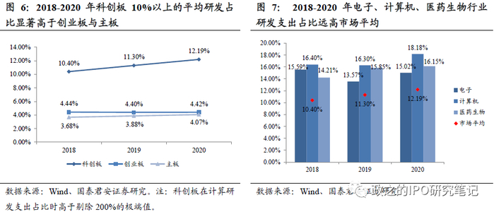 截至2021年6月,从上市数量及规模来看,注册制板块IPO数量/募资规模在整体A股中占比从2019Q3科创板开板时的55%/60.5%提升至2021Q1时的69%/68.91%。在科创板六大领域的正面清单带动下,IPO整体向高新技术产业倾斜,生物医药、电子、通信、计算机等行业IPO数量占比从2018的28.57%提升至2020的33.59%。且带动了全市场平均研发投入从2019H1(科创板注册制改革前)的4.43%提升到了2019H2的9.13%,并在2020年进一步提升至12.25%。