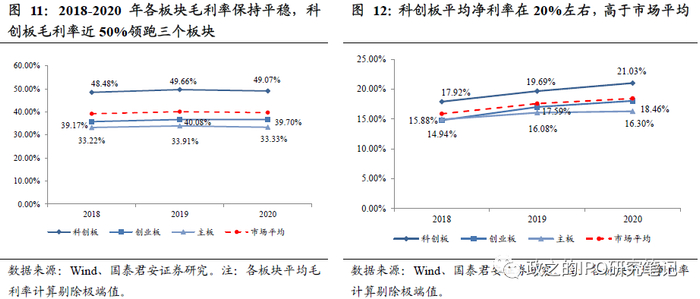 注册制板块盈利能力较强,2020年科创板以49.07%的平均毛利率和21.03%的平均净利率大幅领先其他板块。2018-2020年,科创板毛利率与净利率不断攀升。在剔除负值及极端值前提下,科创板毛利率由48.48%增长至49.07%,净利率由17.92%增长至21.03%。2020年毛利率49.07%大幅领先创业板和主板12.36pct、15.74pct,净利率高出创业板2.99pct、主板4.74pct。注册制板块相对主板显著的毛利率和净利率优势体现出注册制企业较强的盈利能力,也与科创板更多是由盈利能力更强的生物医药等企业构成有关。