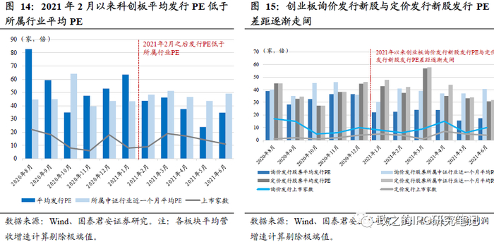 询价中枢下移带动注册制板块新股一二级估值差走阔。当前询价制度下买方市场主导询价中枢持续下移,注册制板块新股发行市盈率持续走低。如我们在2019年4月的报告《从2009至2012年市场化发行阶段的五个角度展望科创板》及2020年4月的报告《科创打新超预期,龙头个股配置集中》中总结的,由于当前询价制度中10%刚性高剔规则存在,注册制板块新股询价中枢持续下移,带动注册制板新股发行PE不断下行,2021H1科创板及创业板网下发行新股平均发行PE分别为41.28倍、22.48倍,科创板、创业板中分别有38.89%、67.35%的股票发行PE不足23倍,注册制板块发行PE与主板形成倒挂。进一步,与新股所属行业估值比价可以发现,2021年2月以来,科创板发行PE已低于所属中证行业近一个月平均PE,且差距持续走阔,5月上市的14只科创板发行PE仅23.92倍,而所属行业平均PE为43.61倍。创业板方面,询价发行新股与定价发行新股发行PE差距逐渐拉大,6月上市的10只询价发行创业板新股发行PE仅17.44倍,远低于所属行业平均PE 40.54倍。注册制板块新股一二级估值差走阔。