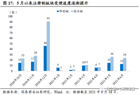 注册制板块受理节奏较一季度提速,恢复至每月受理40家左右水平。一季度受现场检查细则出台、科创属性评价指引修订等一系列监管趋严动作叠加公司年报更新窗口等因素影响,IPO受理节奏有所放缓,一季度注册制板块合计受理企业仅33家。但进入到5月后,随着年报更新完毕,监管修订新规平稳运行,企业受理逐渐提速。截至6月18日,5月及6月注册制板块分别受理39家、37家企业,基本恢复至2020年四季度水平,IPO市场蓄水速度提增。