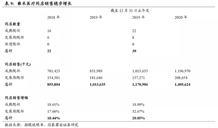 雍禾医疗同店数量和销售稳步增长,成熟院部仍保持超18%的同店销售增长率;