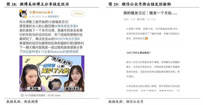 网红营销吸引更多客流。部分机构通过邀请网络红人体验植发项目,或与网络自媒体合作,通过视频、文字等形式分享、推广植发项目。