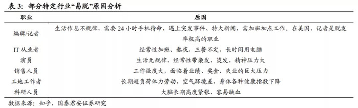 据艾瑞咨询等统计,一些特定行业如IT从业者,由于长期处于高强度高压力环境下且经常加班,因此更易产生脱发问题;
