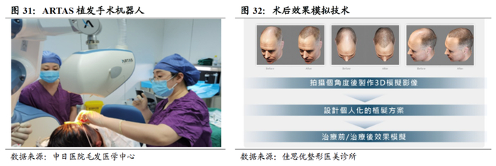 通过应用植发手术机器人,以减少人力投入、达到微创效果。传统植发技术从毛囊提取到毛囊种植均需人工完成,因此耗时较长、需医生团队共同完成、设计人工成本高。植发手术机器人可缩短手术时间、提高植发成活率。目前市场上的ARTAS植发手术机器人可重复高精度切割上万单位移植毛囊,且可通过实时控制和智能算法以最佳角度、深度识别并获取最适宜移植毛囊,同时其皮肤张紧器及内外双针技术,可达到微创效果。
