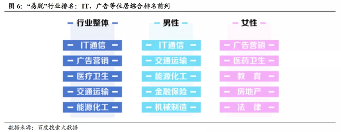 此外男性、女性易脱发行业也有所不同:男性比较易脱发的行业主要有IT通信、交通运输、能源化工、金融保险以及机械制造;而女性则是广告营销、医药卫生、教育、房地产和法律行业。