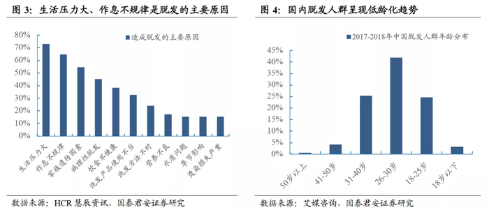 脱发问题亦呈现低龄化发展趋势,80后、90后面临工作、婚姻、教育等压力正逐渐成为脱发群体的主力军,关于“第一批90后开始秃了”的文章亦印发全社会共鸣;