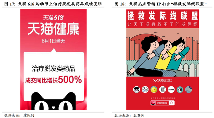 此外,植发行业加强营销力度亦推动消费者关注度、执行力提升。植发行业营销策略从此前地推等线下形式为主(如地铁广告德国),全面迈向以线上为主、线下与线上相结合的模式,如在天猫、京东、小红书等互联网电商渠道商加强营销推广、全面提升曝光率。2021年618期间治疗脱发类药品均取得不错佳绩。