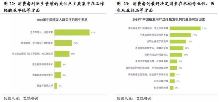 医生的工作经验和机构的专业资质是植发人群的首要考虑因素。作为一种微创手术,植发需要通过微小的切口进行,整个过程较传统手术需要更高的精准度,因此,植发手术需要由经过严格专业训练并具有相关资质认定的医生进行。据艾瑞咨询统计,2018年中国植发人群对于医生资质最关注的就是医生的工作年限以及工作经验,其次是医生的植发设计与审美。此外,所有植发医疗服务提供商均须取得有效的医疗执照,且具备植发医疗服务所需的医疗及护理环境方可经营,因此,通常非专业机构难以满足上述要求。