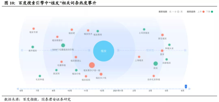 虽然脱发现象愈发普遍、且百度等搜索情况显示热度持续攀升,但国内植发渗透率仍较低,据雍禾医疗招股说明书,2020年国内进行的植发手术仅51.6万例,渗透率仅0.21%;我们认为一方面因消费者对植发手术存在一定的担忧心理,因此防脱洗发水和食疗相对更受欢迎,另一方面因植发手术价格相对更高;
