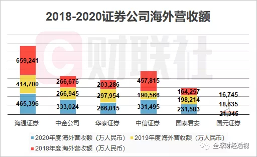 自2017年来,海通证券和中金公司连续4年占据排行榜前两名。华泰证券与中信证券则在2019年-2020年交替占据第三与第四名位置。2018年,排名三四位的分别是山西证券占比17.6%,境外子公司营业收入12.03亿人民币;光大证券占比13%,境外子公司营业收入10亿人民币。2017年,第三第四名分别是中信证券与中原证券。