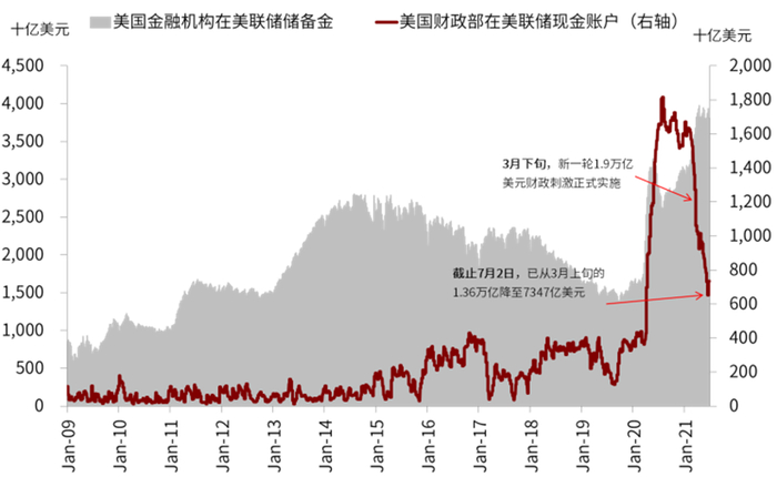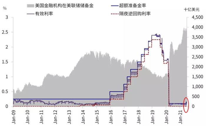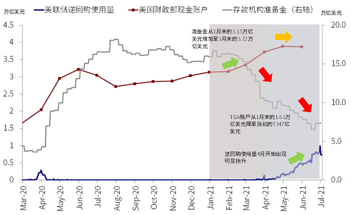2020年5月,为应对新冠疫情对实体经济的冲击,美联储宣布自2020年5月15日存款机构补充杠杆率(Supplementary Leverage Ratio, SLR)豁免计入国债和准备金到SLR的分母中,以便支持存款机构更多的向美国家庭和企业提供信贷。不过这一豁免于2021年3月31日到期,这意味准备金的继续增加将会降低SLR,使得银行无法满足监管要求。所以,3月末开始,银行不再愿意承接更多流动性存款而对自身资产负债表造成进一步压力,表现为准备金增加的放缓。而与商业银行不同,货币市场基金无法通过准备金形式存放多余流动性,此时隔夜逆回购便成为其选择。