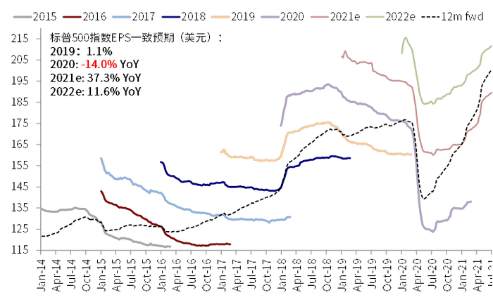 标普500指数2021年EPS一致预期同比增长37.3%,市场一致预期2022年同比增长11.6%