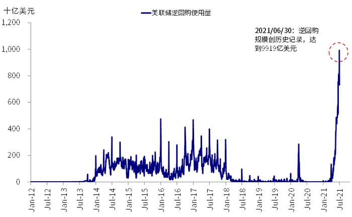 美联储近期逆回购使用规模再创新高,6月月30日当日逆回购规模近1万亿美元