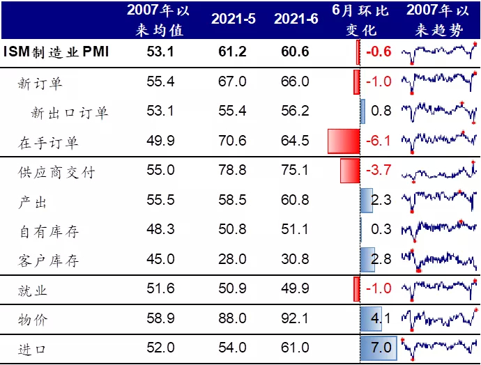 6月ISM制造业PMI从5月的61.2回落至60.6,低于市场预期的60.9,但已是连续13个月处于扩张区间。分项看,新订单、在手订单、供应商交付及就业较前月回落,产出、客户库存、物价及进口抬升明显。