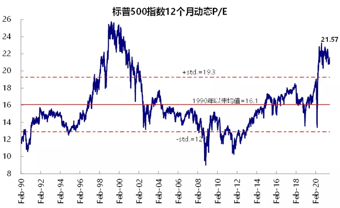当前标普500指数12个月动态P/E回升至21.5倍,超过1990年以来均值向上一倍标准差