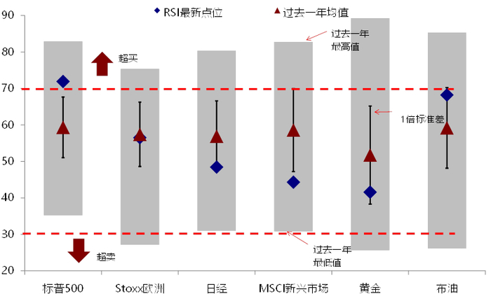 过去一周,美股RSI点位抬升,已超买,欧洲。日本、新兴股市RSI点位回落;油价超买缓解
