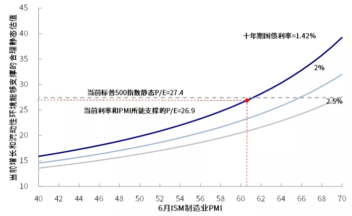 当前标普500的27.4倍静态P/E略高于增长和流动性能够支撑的合理水平(~26.9倍)