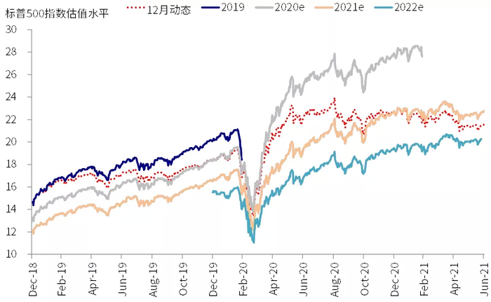 当前标普500指数2021E P/E 22.8倍,2022E P/E 20.4倍