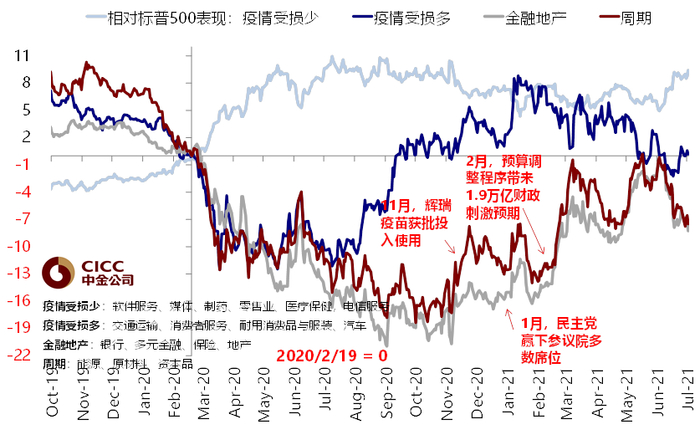 过去一周,疫情受损多、金融地产及周期板块相对跑输,疫情受损少板块相对跑赢