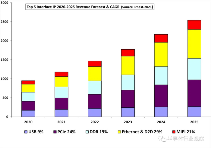 如上图所示,预计大部分增长将来自 PCIe、内存控制器 (DDR) 和以太网和 D2D 三个类别,这几个市场五年的复合年增长率分别为24%、19% 和 29%。这并不奇怪,因为所有这些协议都与以数据为中心的应用程序相关联!该预测要求前 5 名接口 IP 协议在 2025 年的营收跨过25亿美元的大关,这就意味着从2020到2025年的收入复合年增长率为 19%,这非常令人印象深刻!