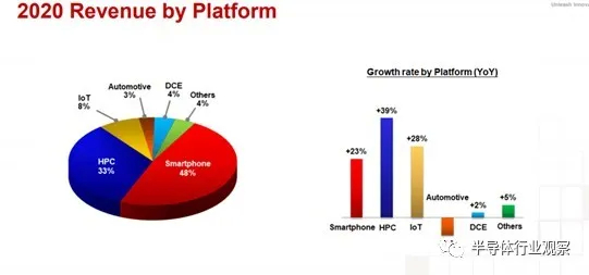 上图显示了台积电在 2017 年和 2020 年按应用划分的收入。我们清楚地看到,HPC 部分已从收入的 17% 上升到 33%(几乎翻了一番)。此外,HPC 的增长率最高,2020 年为 39%。如果考虑到台积电 2017 年的年收入为 320亿美元,2020 年增长至 460亿美元,增长了44%,那么 HPC 产生的收入在2017 年和 2020 年之间增长了 135% !