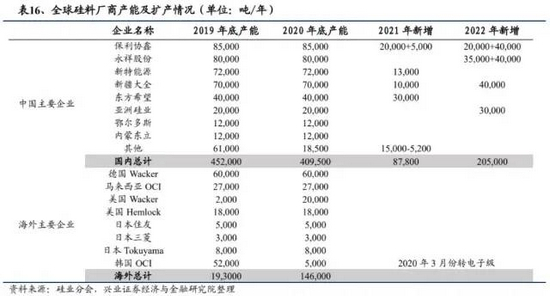 2020年高成本产能退出市场,2021年新产能释放较少。在2020年的疫情以及其带来的产业需求低迷的状态下,国内及海外的部分高成本多晶硅产能退出市场。根据硅业分会的统计,国内的多晶硅产能从2019年底的45.2万吨下降到2020年底的41.0万吨,同比减少4.3万吨,海外多晶硅产能从2019年底的19.3万吨下降到2020年底的14.6万吨,同比减少4.7万吨。同时,预计2021年仅有中国的8.8万吨新增产能,年底全球产能约64万吨。考虑到2021年新增产能建成时间较晚,预计全年多晶硅全球供给在57万吨左右。