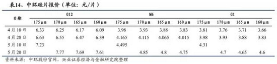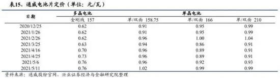 头部厂商频繁调整报价,各环节博弈有越来越激烈的趋势。从硅片、电池片环节头部厂商报价情况来看,光伏产业链价格上涨趋势正在加剧,产业内博弈也逐渐激烈。隆基、通威的报价频率从今年3月以前的每月报价,逐步变成了半个月甚至间隔5天调整报价。2021年5月25日,隆基官网在5月14日报价的基础上,将G1硅片由4.39元/片上涨至4.79元/片,涨价0.4元/片,涨幅9.1%;M6硅片由4.49元/片上涨至4.89元/片,涨幅8.9%;M10由5.39元/片,上涨至5.87元/片,涨幅8.9%。2021年5月21日,通威在其5月11日报价基础上,将多晶金刚线价格从0.83元/片上调至0.86元/片,单晶Perc单/双面158.75电池片由1.02元/片上涨到1.10元/片;单晶Perc单/双面166电池片由0.99元/片上涨到1.08元/片;单晶Perc单/双面210电池片由0.99元/片上涨到1.08元/片。