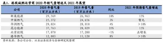 城燃商销气量情况良好,对2021年展望乐观。2020年,我国天然气消费量达到3240亿立方米,同比增长5%。受疫情影响,各大城市燃气运营商经营面临很大压力。随着疫情的逐渐好转与经济的逐步恢复,从我们统计的主要上市的大型全国性城燃公司来看,除北京控股销气量增速为负外,昆仑能源销气量达到377.6亿方,同比增速高达35%,远超年初指引;新奥能源销气量达到295.7亿方,同比增速高达10%;港华燃气销气量达到120.0亿方,同比增速达到8%,华润燃气和中国燃气的销气量增速分别为4%、3%。2021年,新奥能源和昆仑能源仍然给出15%的销气量增速目标,华润和港华燃气则给出大于10%的销气量增速目标。