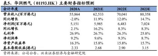 我们的观点:公司作为民营城市燃气龙头企业,销气量增长复苏趋势明确,售气价差维持平稳,泛能业务和增值业务对收入和毛利贡献的确定性和成长性较强。我们预测公司2021、2022和2023年的营收分别为845.50、993.63和1131.63亿元,净利润分别为69.22、79.79和91.87亿元。EPS分别为6.13、7.09和8.16元,给予公司目标价132.03港元,对应2021年18倍PE,维持“买入”评级。