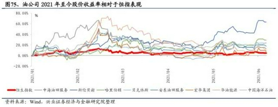 2021年初至今,油公司股价收益率表现较好。年初至2021年06月08日,斯伦贝谢、哈里伯顿、贝克休斯、中国海洋石油、中海油田服务、安东油田服务、宏华集团、华油能源分别取得64.7%、29.6%、25.3%、27.9%、12.6%、17.8%、8.0%和9.3%的收益率,均超过恒指同期取得的4.8%的收益率。
