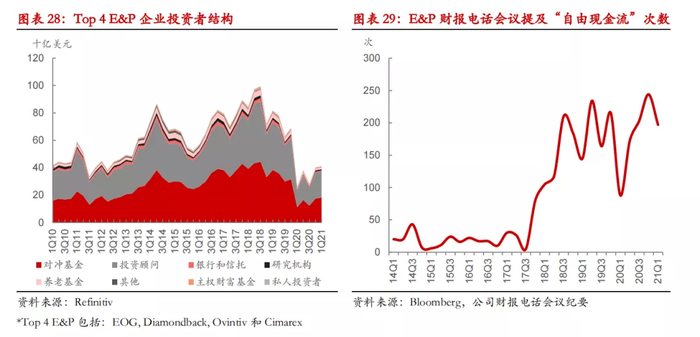 过去高负债,低回报的发展模式越来越不被投资者接受,寻求高增长的投资者在疫情前已经开始退出该行业,留存的投资者对于E&P企业的估值的评判标准逐渐从“扩张”转向“盈利”。2021年可能是美国页岩油“新时代”的开始,在化石燃料的前途受到新能源和政策不确定性压力越来越大的当下,资本约束,偿还债务,产生自由现金流和提高股东回报成为E&P优先事项,增产和争夺油藏资源变得更谨慎。