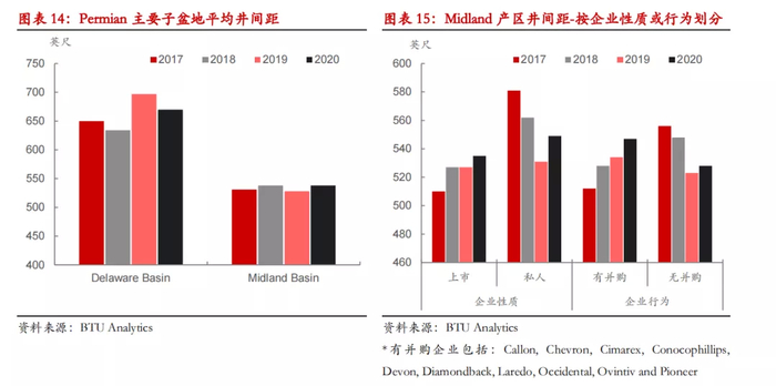 页岩井产量衰减速度加快一直以来都受到市场关注,井间距不足和油层压力下降都被普遍认为是影响因素之一。因此,井间距的变化也成为可能影响油井产出效率的因素之一。2016年之后,大量资本投入帮助生产商在Permian“疯狂”扩大土地占有面积,为了最大化将储量转化成产量,生产商通过缩小井间距的方式尽可能多的打井,邻井间连通(Frac hit)和子母井等一系列降低油井产出效率的问题随之而来。新冠疫情后,E&P企业面临钻探活动下降和行业整合加速的市场环境,一些土地占有面积较大的生产商开始尝试扩大井间距。综合来看Permian两大子产区Delaware和Midland近几年井间距的变化,Delaware能够看到井间距扩大的趋势,而Midland没有非常明显的趋势,但如果区分企业性质和行为之后就可以看到明显的结构性的变化。上市的E&P企业近几年基本在逐步扩大井间距,但私人E&P企业受限于土地面积仍然压缩井间距,如果进一步观察2018年之后进行过并购的E&P企业可以更加确认这一趋势,发生过并购的E&P企业在两个盆地2020年井间距较2017年分别上升14%和7%。