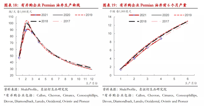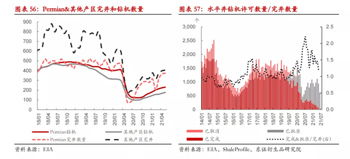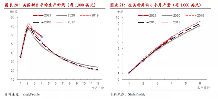 我们看到新井无论是第2月的产量峰值还是前6个月的累计产量(每1,000英尺)都在2019年见顶,2021年初步数据显示产出效率仅比去年略有改善。在过去资本较充足的时期,生产商可以通过大量增加完井来弥补产出效率的下滑,进而实现增产,但在今年资本相对短缺的阶段,完井数量不足导致产出效率下滑的问题进一步暴露,也从侧面说明产出效率的优化同样比较可能出现在资本支出相对充裕的时期。