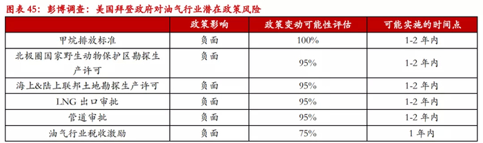 传统油气行业在 “绿色新政”背景下面临的潜在政策风险主要集中在:甲烷等温室气体(GHG)排放标准趋严,特殊地区和联邦土地勘探生产许可收紧,管道项目环境审批趋严,以及税收政策的调整。