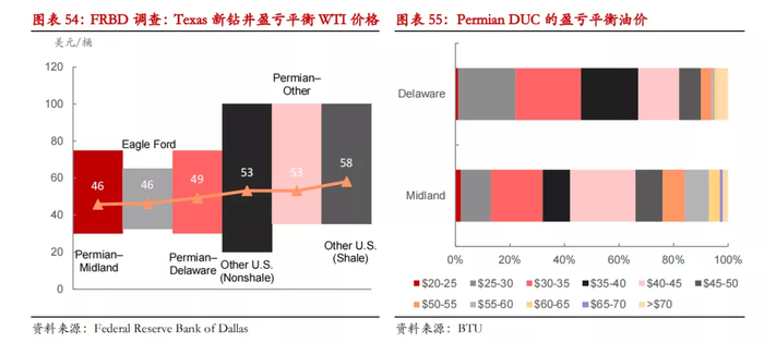 分产区来看,Dallas联储一季度的调查显示Permian产区整体在53美元油价以下已经能够实现新井盈亏平衡,而60美元的油价90%的DUC也能够实现经济性,这也解释了疫情后钻井和完井活动的回升基本集中在Permian地区的原因。同时,生产商利用库存DUC加快完井速度,这意味着Permian将领先其他产区率先出现产量增长,而其他经济性较差的盆地产量则可能继续下降。从钻机和完井数据来看,5月Permian地区钻机数量较疫情前高点仍偏低43%,疫情期间完井数量下降形成一定规模水平井许可,对生产商增加完井提供可能,生产商消化了超过1,000个DUC来抵消钻机下滑对产量的影响,Permian完井数量至5月仅比疫情前低20%。