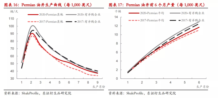 理论上,更宽的井间距意味着单井可获得的储层资源更多,发生邻井间连通的可能性降低,从而能够获得更高的产出效率。观察生产曲线可以发现,有并购的企业(井间距扩大)2020年新井第二月产量较2017年新井提升7.2%,Permian平均提升4.3%,同时2020年的新井初期(前5个月)的衰减要略快于Permian其他生产商新井,这也导致有并购企业2020年新井前6个月产量较2017年新井仅提升3.5%,而Permian其他平均能够提升5.8%。不过,2020年的新井从第5个月开始衰减速度就慢于2019年的新井,这说明扩大井间距对产出效率提升有一定正面影响,但延伸水平井会抵消更宽的井间距对产出效率的提升,此外,井间距扩大对延缓后期产量衰减还是有一定正面作用。