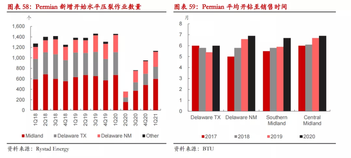 一季度末Permian每月开始压裂作业的油井数量已达到维持产量所需的数量,这意味着在钻机增加和大量DUC的缓冲下,从二季度开始Permian地区已经具备产量回升的潜力,从产量数据上也可以得到印证。DUC能够提供短期的完井储备,加快兑现产量的时间,而钻机数量回升是决定持续增产潜力的关键,近年来Permian平均开钻到销售的时间从5.6个月增加至6.6个月。Permian产量在5月已回升至455万桶/天,距离2020年3月的峰值489万桶/天仅低6.8%,按照目前钻机增长速度推测,预计在四季度Permian地区将成为率先看到产量回升的地区。