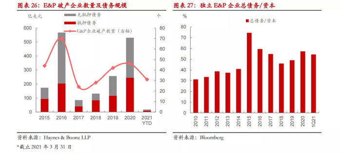 从2011年开始,美国页岩油行业开启飞速发展,至2020年疫情前美国原油产量实现了累计超过700万桶/天的增长。回顾从2011年开始页岩油行业的几轮发展,2011年至2014年,技术进步驱动产量增长,2014年与沙特的价格战导致油价暴跌,美国产量经历两年下滑,但在2016年到2019年,大量资本投入带来第二轮增产,尽管这期间油价远不及上一轮。技术进步和资本投入带来油气产量激增的结果是美国跃居全球第一大产油国,有效降低了对原油进口的依赖度。但代价也是非常显著的,2011年至2018年上市独立E&P企业连续八年自由现金流为负,每年产生正FCF的企业比例不超过30%,2015年至今有262个E&P企业破产,累计债务规模超过1,760亿美元。行业普遍杠杆率较高,从2015年以来,上市E&P平均资本负债率始终维持在50%以上,尽管2016至2018年有所下降,但近两年仍有上升。