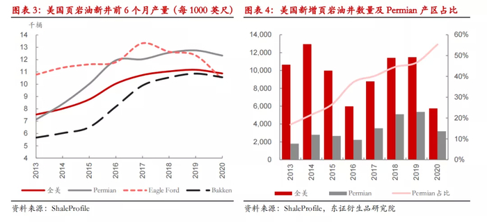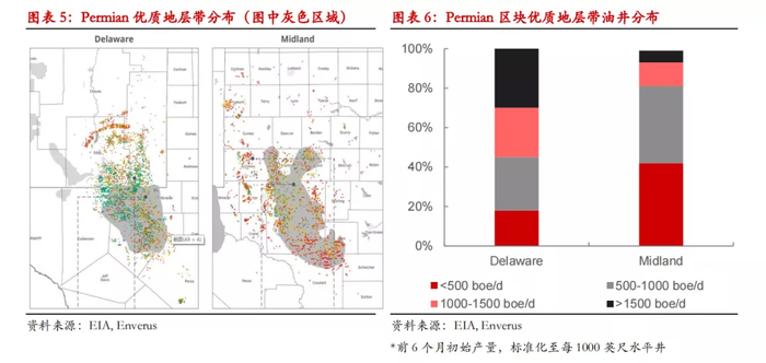 回顾过去几年美国页岩油产出效率的变化,可以看到2016年是一个转折性的年份,在此之前,产出效率快速提升,一方面归因于技术进步,另一方面是由于上游钻探生产活动逐渐向美国油气资源储量最大的Permian产区集中,Permian每年新增油井数量占全美总量的比重逐年上升,地层结构是影响页岩油生产效率的一个重要指标,在一定程度上奠定了这个阶段产出效率高速增长的基础。