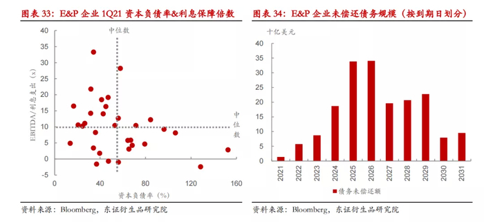 观察E&P企业负债状况发现,独立页岩油商负债水平仍然较高,有近一半的E&P公司资本负债率超过50%,对于这些企业来说,改善资本负债表的诉求较强,尽管2023年前未偿还的债务规模不大,但长期债务压力仍然较大,2024年起又将经历一波债务高峰。从上市公司套保行为角度来说,由于2020年经历市场巨大的不确定性,上市生产商套保比例较高,套保规模达到2021年预期产量的45%,且大部分发生在2020年四季度及以前,因此尽管今年以来油价持续上涨,但生产商套保亏损仍然可能达到110亿美元。页岩油短生产周期和高衰减率的特点决定了行业对持续资本支出的依赖,但考虑到短期的套保亏损和中长期债务压力等因素,这将使得未来整体的资本支出规模受限。