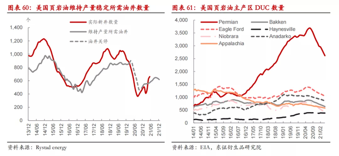 页岩油新井产出效率在2019年见顶,2021年初步数据显示产出效率仅比去年略有改善。资本约束限制生产商对新油藏区域的开发意愿,水平井长度是上一轮产出效率增长的核心因素,现阶段的新井水平井长度已经普遍超过最佳的区间,目前生产商这样做的目的主要是为了降低成本。