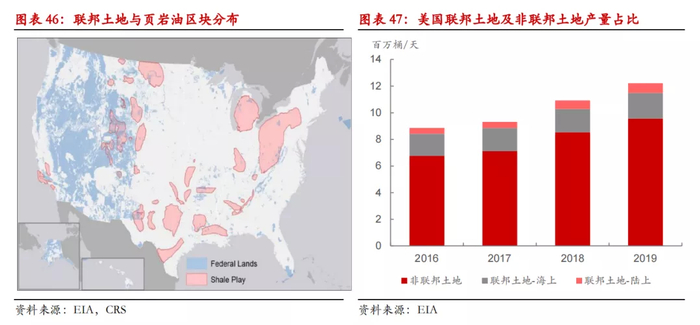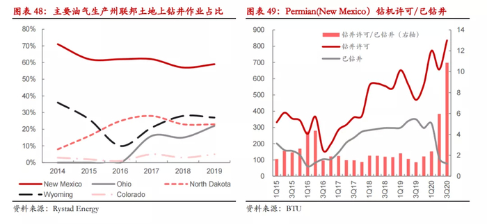 对于联邦土地上的钻井许可和管道许可也是生产商关注的主要风险之一。美国陆上联邦土地主要集中在西部地区,与页岩油气生产区块的重合并不多,从面积来说,仅有9.9%的页岩油生产区块位于联邦土地上。因此有限的面积导致联邦土地上原油产量占全国产量的比重并不大,2019年仅有6%的原油产量来自于陆上联邦土地,海上联邦土地的原油产量贡献相对较大,能够达到16%。New Mexico,Wyoming和Colorado是联邦土地占比较广的油气生产州,其中New Mexico联邦土地上的钻井活动相对份额较大,一直在60%左右波动,其他两个州的占比在2017-2019年间基本维持在25%。生产商出于对未来联邦土地区块获取困难的担忧,在拜登政府竞选期间就开始大量囤积新的钻探许可,在Permian的Delaware子盆地,大量的生产区域位于New Mexico的联邦土地上,因此也观察到2020年钻机许可申请的大幅攀升,但实际钻井数量由于市场动荡而大幅下降,囤积的大量许可在短时间内给生产商提供了一些灵活性。除了生产活动,新管道许可也面临障碍,Atlantic Coast Pipeline被取消,Dakota Access Pipeline环境审查仍在进行中。尽管目前监管的重点主要集中在联邦土地,这些地区未来的钻井活动和产量可能下降,同时联邦土地的监管趋严也可能导致非联邦土地的竞争加剧,未来获取钻探许可的难度上升,对生产商长期经营面临风险。